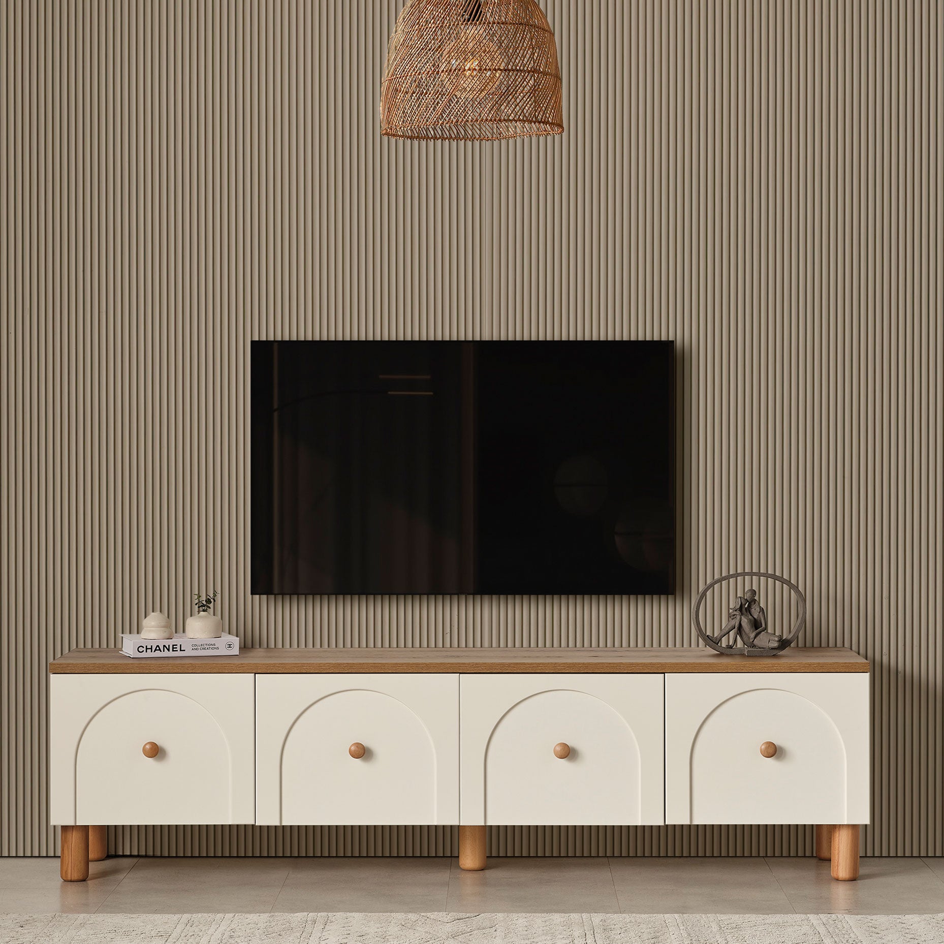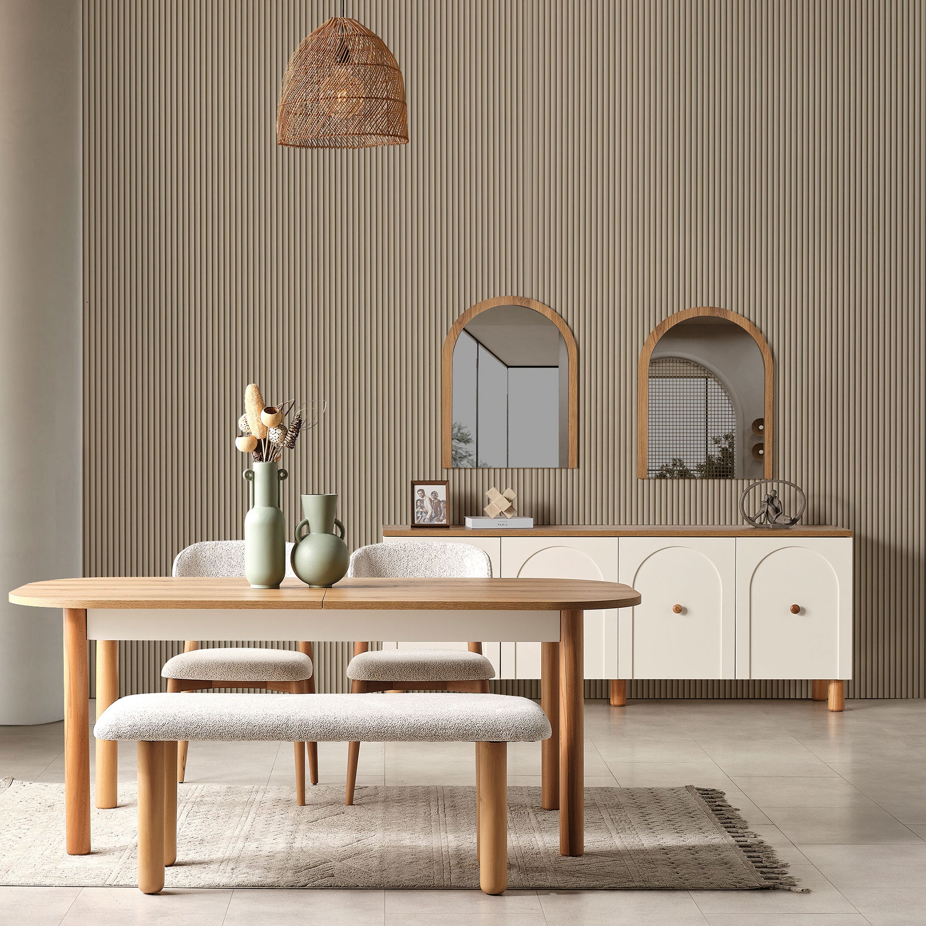 The refreshing effect of white combined with the natural texture of wood creates a warm and inviting atmosphere in your space. Offering both aesthetics and comfort, this set reflects the unique spirit of bohemian style and enhances the elegance of your room.